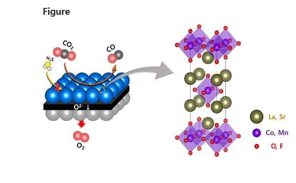 We report a highly improved cathode catalyst by doping fluorine anions in oxygen sites of a Ruddlesden–Popper material for CO2 electrolysis to produce CO in solid oxide electrolysis cells (SOECs). The obtained fluorine-doped catalyst of La0.9Sr0.8Co0.4Mn0.6O3.9−δF0.1 (R.P.LSCoMnF) exhibited the higher electrochemical performance of 499 mA/cm2 at 1.3 V and 850 °C with the smaller polarization resistance of 0.853 Ω·cm2 than those of the undoped catalyst of La0.9Sr0.8Co0.4Mn0.6O4−δ (R.P.LSCoMn). Moreover, a high faradaic efficiency of 98.6% and a CO production rate of 135 μmol/cm2·min were achieved for CO2 electrolysis reaction in the single cell with the R.P.LSCoMnF cathode catalyst. These enhanced performances are mainly attributed to the improved properties of surface exchange of oxygen and bulk oxygen diffusion by fluorine doping. More importantly, a negligible sign of performance degradation was observed from the galvanostatic test under CO2 gas streams containing H2S gas, and its structure was maintained even after exposure to 100 ppm H2S in an N2 gas stream at 850 °C for 10 h, suggesting that R.P.LSCoMnF is highly robust against poisonous sulfur species. Therefore, this newly developed fluorine-doped Ruddlesden–Popper catalyst could be a promising cathode for the electrolysis of sulfur-containing CO2 gas stream, which is emitted from steel-making blast furnaces or power plants.