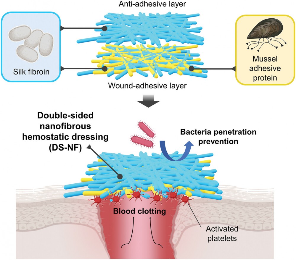 Topical hemostatic agents are preferred for application to sensitive bleeding sites because of their immediate locoregional effects with less tissue damage. However, the majority of commercial hemostatic agents fail to provide stable tissue adhesion to bleeding wounds or act as physical barriers against contaminants. Hence, it has become necessary to investigate biologically favorable materials that can be applied and left within the body post-surgery. In this study, a dual-sided nanofibrous dressing for topical hemostasis is electrospun using a combination of two protein materials: bioengineered mussel adhesive protein (MAP) and silk fibroin (SF). The wound-adhesive inner layer is fabricated using dihydroxyphenylalanine (DOPA)-containing MAP, which promotes blood clotting by aggregation of hemocytes and activation of platelets. The anti-adhesive outer layer is composed of alcohol-treated hydrophobic SF, which has excellent spinnability and mechanical strength for fabrication. Because both proteins are fully biodegradable in vivo and biocompatible, the dressing would be suitable to be left in the body. Through in vivo evaluation using a rat liver damage model, significantly reduced clotting time and blood loss are confirmed, successfully demonstrating that the proposed dual-sided nanofibrous dressing has the right properties and characteristics as a topical hemostatic agent having dual functionality of hemostasis and physical protection.