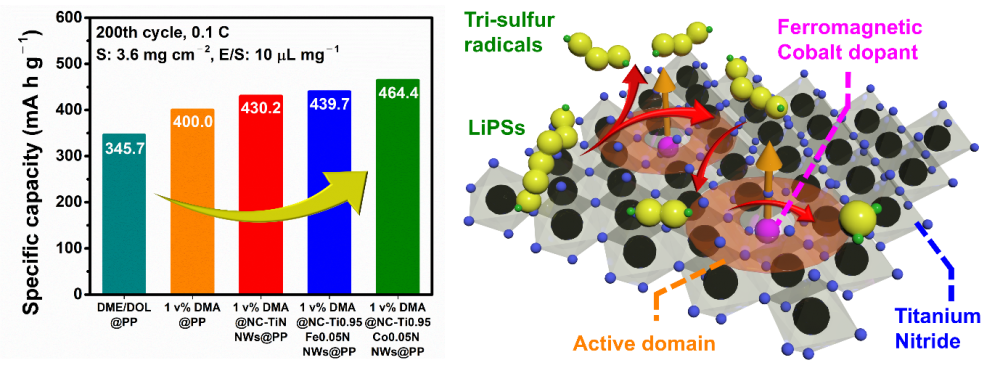 Electrolyte modification with a high donor-number solvent is necessary to increase sulfur utilization, but it also presents poor compatibility with lithium metal. The amount of the solvent should be optimized to maximize sulfur utilization at the cathode and minimize side reactions with Li metal at the anode. An electrolyte solution comprising 1 vol% N,N-dimethylacetamide (DMA) in a 1,2-dimethoxyethane (DME)/1,3-dioxolane (DOL) co-solvent demonstrated increased discharge capacity and reduced overpotential compared to DME/DOL and DMA/DOL. In addition to electrolyte, modification that creates radical-mediated pathways from a high donor-number solvent, long-cycle performance is achieved by effectively mitigating the shuttling effect and enhancing reaction kinetics with an efficient electrocatalyst. Cobalt doping into TiN introduced an upshift of the d-band center with ferromagnetic properties that suppressed the shuttling effect, activated radical-mediated pathways, and facilitated the Li2S conversion. A multifunctional separator fabricated with N-doped carbon-embedded cobalt-doped titanium nitride nanowires (NC-Ti0.95Co0.05N NWs) under 1 vol% DMA electrolyte achieved a discharge capacity of 464.4 mA h g−1 even after 200 cycles at a decay rate of 0.093% per cycle through the synergistic effects of electrolyte and electrocatalyst modifications. This work highlights the importance of ferromagnetic catalysts with a high donor-number solvent for lithium–sulfur (Li–S) batteries.