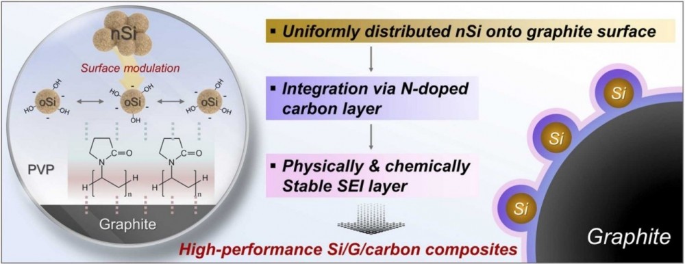 Silicon is a promising anode material for lithium-ion batteries (LIBs) due to its high theoretical capacity. However, its practical application is hindered by severe volume expansion and low electrical conductivity. To improve stability, silicon/graphite (Si/G) composites are commonly used, but achieving uniform integration remains challenging due to the distinct surface chemistry of silicon and graphite. To address this issue, we developed a surface modification strategy integrating silicon oxidation treatment and polyvinylpyrrolidone (PVP) as an amphiphilic stabilizer to enhance dispersion, interfacial bonding, and structural stability in Si/G composites. The oxidation treatment introduced hydroxyl functional groups on the silicon surface, improving its hydrophilicity and facilitating strong interactions with PVP. Simultaneously, PVP acted as a chemical bridge, stabilizing graphite while reinforcing adhesion between silicon and graphite. The subsequent carbonization of PVP generated N-doped carbon, improving electrical conductivity and mechanical integrity. The resulting composite exhibited an initial specific capacity of 717 mAh g−1 and retained 92.3 % of its capacity after 500 cycles. Furthermore, the modified composite demonstrated reduced electrode thickness after cycling, effectively mitigating volume expansion. This study exhibits the effectiveness of tailored interfacial chemistry and structural engineering in developing long-lifespan Si/G composites for next-generation LIBs. The proposed approach offers a scalable, environmentally friendly solution for industrial implementation, paving the way for energy storage technologies with enhanced cycle stability and electrochemical performance.