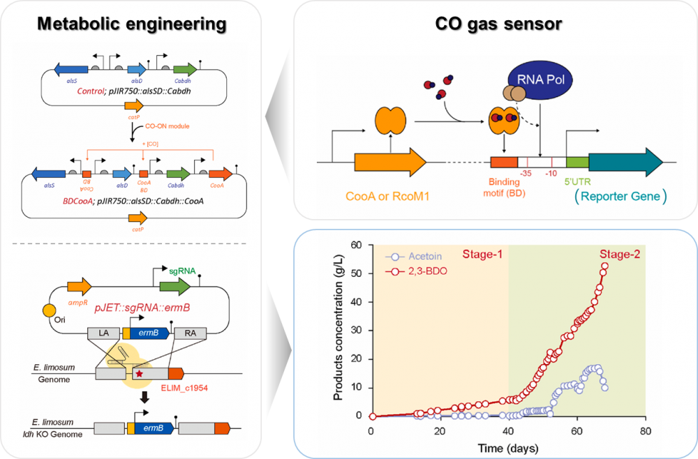 Dynamic sensing of gas substrates like toxic carbon monoxide (CO) in living microbial cells is often limited due to the lack of suitable biosensors. Here, we integrated the CO-binding transcription activators, CooA and RcoM1, with an O2-independent fluorescent reporter system, Halo-tag, to develop CO-sensing modules (ON/OFF) capable of detecting CO concentrations in the strictly anaerobic acetogenic bacterium Eubacterium limosum. Furthermore, we employed CooA as the CO-sensing ON module to activate the target genes for 2,3-butanediol (2,3-BDO) biosynthesis, achieving a 1.7-fold increase in 2,3-BDO yield. These results indicate that the CO-ON module effectively redirects carbon flux toward target product biosynthesis pathway in acetogens. However, during CO gas with glucose mixotrophic fermentation, lactate emerged as the predominant product. To enhance target pathway flux using the CO-ON module, we deleted the lactate pathway in E. limosum using CRISPR/Cas9. The resulting engineered strain showed an 18.5 % increase in carbon utilization for 2,3-BDO production under CO sensing culture conditions. This optimized platform strain subsequently produced approximately 52 g/L of 2,3- BDO during two stage CO-glucose mixotrophic fermentation. Our results provide orthogonal CO-sensing transcriptional regulatory modules for engineering metabolic pathways that efficiently convert CO into value-added biochemicals using acetogenic biocatalysts.