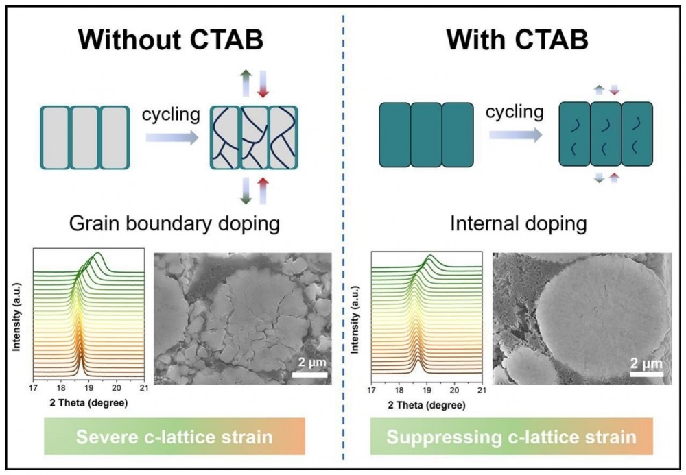 Co-free high-Ni cathode materials, which offer advantages such as high energy density and low cost, exhibit unsatisfactory cyclic life due to severe c-lattice distortion during cycling. In existing doping strategies, charge imbalance and ionic size differences with Ni3+ prevent the incorporation of high-valence dopants into primary particles during the calcination, thereby limiting their ability to suppress lattice strain. In this study, we employ a new doping strategy utilizing organic surfactants during the co-precipitation process to homogeneously position Zr4+ ions within the primary particles of LiNi0.9Mn0.1O2. Zr4+ ions located within the primary particles exerted a pillar effect, significantly enhancing the structural robustness of the material. During the first cycle, the c-lattice contraction is reduced, effectively inhibiting microcrack formation in the particles. As a result, it exhibits a significantly improved capacity retention of 98.6 % (189.2 mAh g−1) after 100 cycles.