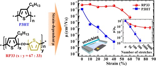 Although intermolecular charge transport is known to occur via π–π stacking, the influence of π–π stacking on the mechanical properties of polymers has received little attention compared with other dynamic noncovalent interactions. Herein, we demonstrate a method to enhance stretchability via lowering crystallinity and increasing π–π stacking of thiophene-based random copolymer chains, which causes π–π stacking-induced polymer networks to form within the fully conjugated semiconducting polymer matrix. The polymer networks contain coiled amorphous chains that aid energy dissipation when the polymer film is subjected to strain; furthermore, the π–π stacking prevents the chains from irreversible sliding out of place due to the applied strain and provides interchain charge transport. Consequently, we are able to improve the polymer’s mechanical properties such as elongation at break, tensile strength, and toughness along with charge mobility. Additionally, our polymer shows great tolerance to a 40% strain without a decrease in mobility while maintaining a stable electrical performance even after 5000 stretching cycles at 30% strain.
