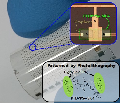 Organic ambipolar transistor arrays for chemical sensors are prepared on a flexible plastic substrate with a bottom-gate bottom-contact configuration to minimize the damage to the organic semiconductors, for the first time, using a photolithographically patternable polymer semiconductor. Well-balanced ambipolar charge transport is achieved by introducing graphene electrodes because of the reduced contact resistance and energetic barrier for electron transport.