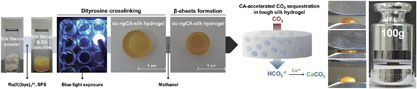 The development of carbonic anhydrase (CA)-based materials for the environment-friendly sequestration of carbon dioxide (CO2) under mild conditions would be highly valuable for controlling emissions to the environment and for producing value-added chemicals. Here, a highly tough and stable CA-encapsulating silk protein hydrogel was developed as a robust biocatalyst for CO2 sequestration through a bioinspired dual-crosslinking strategy that employed photoinduced dityrosine chemical crosslinking followed by dehydration-mediated physical crosslinking. The target enzyme was efficiently encapsulated in the silk hydrogel with ~60% retention of the activity of free CA, and the encapsulated CA exhibited excellent overall multi-use, storage and thermal stabilities. The dual-crosslinked CA-encapsulating silk hydrogel exhibited a significant compressive modulus, which surpassed the moduli of most traditional and double-network hydrogels as well as those of enzyme-encapsulated hydrogels. This hydrogel also showed high resiliency and elasticity and outstanding structural stability. Importantly, the dual-crosslinked CA-encapsulating silk hydrogel facilitated the sequestration of CO2 into calcium carbonate with high CO2 hydration activity. Thus, the unique combination of bioinspired dual-crosslinking with silk fibroin protein and CA enzyme demonstrates the successful application of this protein hydrogel as a promising biocatalyst for CO2 sequestration by showing high activity, strong mechanical properties and outstanding structural stability.