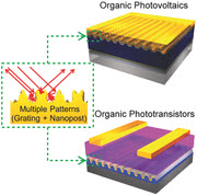 Multiple-patterned nanostructures prepared by synergistically combining block-copolymer lithography with nano-imprinting lithography have been used as back reflectors for enhancing light absorption in organic optoelectronic devices. The multiple-patterned electrodes have significantly boosted the performance of organic photovoltaics and phototransistors, owed to the highly effective light scattering and plasmonic effects, extending the range of their practical applications.