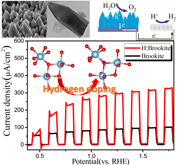 As a representative photocatalyst for photoelectrochemical solar water splitting, TiO2 has been intensively studied but most researches have focused on the rutile and anatsase phases because brookite, another important crystalline polymorph of TiO2, rarely exists in nature and is difficult to synthesize. In this work, hydrogen doped brookite (H:brookite) nanobullet arrays were synthesized via a well-designed solution reaction for the first time. H:brookite shows highly improved PEC properties with excellent stability, enhanced photocurrent, and significantly high Faradaic efficiency for overall solar water splitting. To support the experimental data, ab initio density functional theory calculations were also conducted. At the interstitial doping site that has minimum formation energy, the hydrogen atoms act as shallow donors and exist as H+. which has the minimum formation energy among three states of hydrogen (H+. H0, and H−). The calculated density of states of H:brookite shows a narrowed bandgap and an increased electron density compared to the pristine brookite. The combined experimental and theoretical results provide frameworks for the exploration of the PEC properties of doped brookite and extend our knowledge regarding the undiscovered properties of brookite of TiO2.