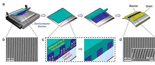 A 50 nm‐wide 6,13‐bis(triisopropylsilylethynyl) pentacene nanowire (NW) array is fabricated on a centimeter‐sized substrate via a facile nanograting‐assisted pattern‐transfer method. NW growth under a nanoconfined space adopts a lattice‐strained packing motif of the NWs for strong intermolecular electronic coupling, and thus a NW‐based organic field‐effect transistor shows high field‐effect mobility up to 9.71 cm2 V−1 s−1.