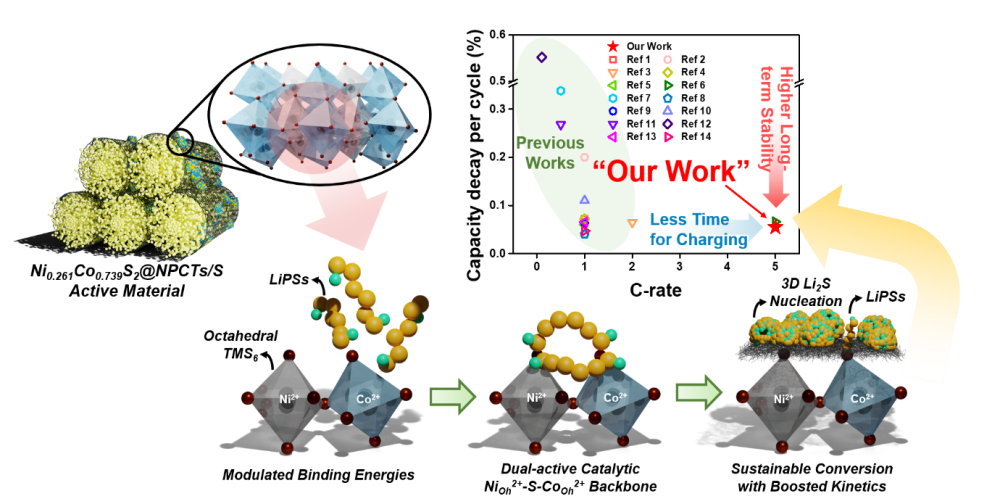 Despite the very high theoretical energy density, Li-S batteries still need to fundamentally overcome the sluggish redox kinetics of lithium polysulfides (LiPSs) and low sulfur utilization that limit the practical applications. Here, highly active and stable cathode, nitrogen-doped porous carbon nanotubes (NPCTs) decorated with NixCo1-xS2 nanocrystals are systematically synthesized as multi-functional electrocatalytic materials. The nitrogen-doped carbon matrix can contribute to the adsorption of LiPSs on heteroatom active sites with buffering space. Also, both experimental and computation-based theoretical analyses validate the electrocatalytic principles of co-operational facilitated redox reaction dominated by covalent-site-dependent mechanism; the favorable adsorption-interaction and electrocatalytic conversion of LiPSs take place subsequently by weakening sulfur-bond strength on the catalytic NiOh2+−S−CoOh2+ backbones via octahedral TM-S (TM = Ni, Co) covalency-relationship, demonstrating that fine tuning of CoOh2+ sites by NiOh2+ substitution effectively modulates the binding energies of LiPSs on the NixCo1-xS2@NPCTs surface. Noteworthy, the Ni0.261Co0.739S2@NPCTs catalyst shows great cyclic stability with a capacity of up to 511 mAh g−1 and only 0.055% decay per cycle at 5.0 C during 1000 cycles together with a high areal capacity of 2.20 mAh cm−2 under 4.61 mg cm−2 sulfur loading even after 200 cycles at 0.2 C. This strategy highlights a new perspective for achieving high-energy-density Li-S batteries.