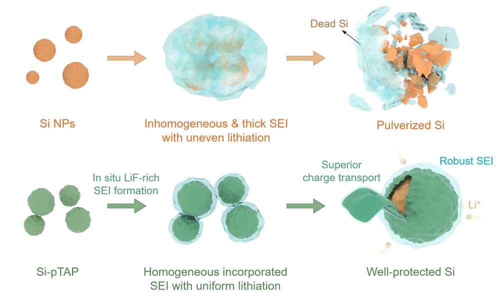The extreme volume expansion of the silicon (Si) anodes during repeated cycles seriously induces undesirable interfacial side reactions, forming an unstable solid electrolyte interphase (SEI) that degrades the electrode integrity and cycle stability in lithium-ion batteries, limiting their practical applications. Despite considerable efforts to stabilize the SEI through surface modification, challenges persist in the development of high-performance Si anodes that effectively regulate intrinsic SEI properties and simultaneously facilitate electron/ion transport. Here, a highly conductive and organic electrolyte-compatible lamellar p-toluenesulfonic acid-doped polyaniline (pTAP) layer is proposed for constructing a robust artificial SEI on Si nanoparticles to achieve fast charging, long-term cycle lifespan and high areal capacity. The spatially uniform pTAP layer, formed through a facile direct-encapsulation approach assisted by enriched hydrogen bonding, contributes to the effective formation of in situ SEI with an even distribution of the LiF-rich phase in its interlamination spaces. Furthermore, the integrated artificial SEI facilitates isotropic ion/electron transport, increased robustness, and effectively dissipates stress from volume changes. Consequently, a notably high rate performance of 570 mAh g−1, even at a substantially high current density of 10 A g−1, is achieved with excellent cyclic stability by showing a superior capacity over 1430 mA h g−1 at 1 A g−1 after 250 cycles and a high areal capacity of ca. 2 mA h cm−2 at 0.5 C in a full cell system. This study demonstrates that the rational design of conductive polymers with SEI modulation for surface protection has great potential for use in high-energy-density Si anodes.