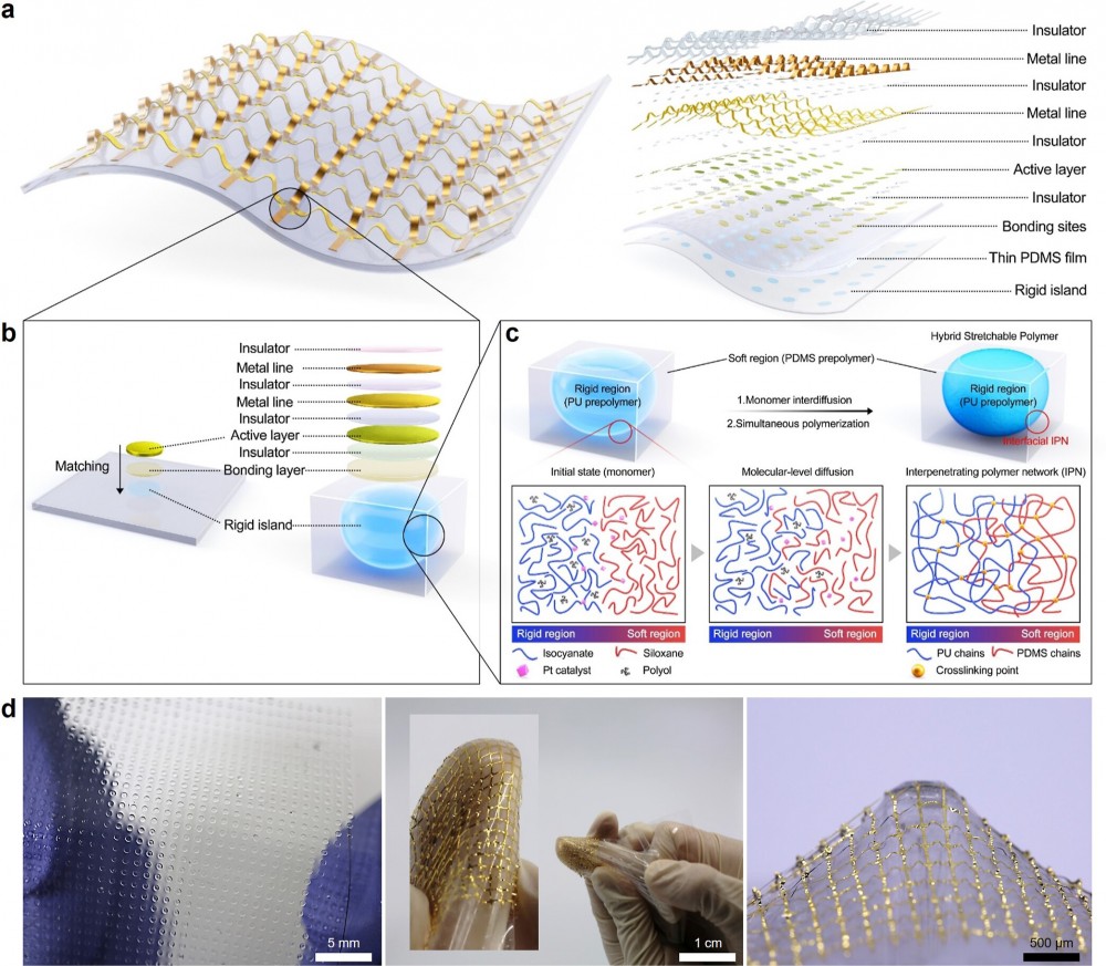 Abstract: Various strain isolation strategies that combine rigid and stretchable regions for stretchable electronics were recently proposed, but the vulnerability of inorganic materials to mechanical stress has emerged as a major impediment to their performance. We report a strain-isolation system that combines heteropolymers with different elastic moduli (i.e., hybrid stretchable polymers) and utilize it to construct a rugged island-bridge inorganic electronics system. Two types of prepolymers were simultaneously cross-linked to form an interpenetrating polymer network at the rigid–stretchable interface, resulting in a hybrid stretchable polymer that exhibited efficient strain isolation and mechanical stability. The system, including stretchable micro-LEDs and microheaters, demonstrated consistent operation under external strain, suggesting that the rugged island-bridge inorganic electronics mounted on a locally strain-isolated substrate offer a promising solution for replacing conventional stretchable electronics, enabling devices with a variety of form factors.