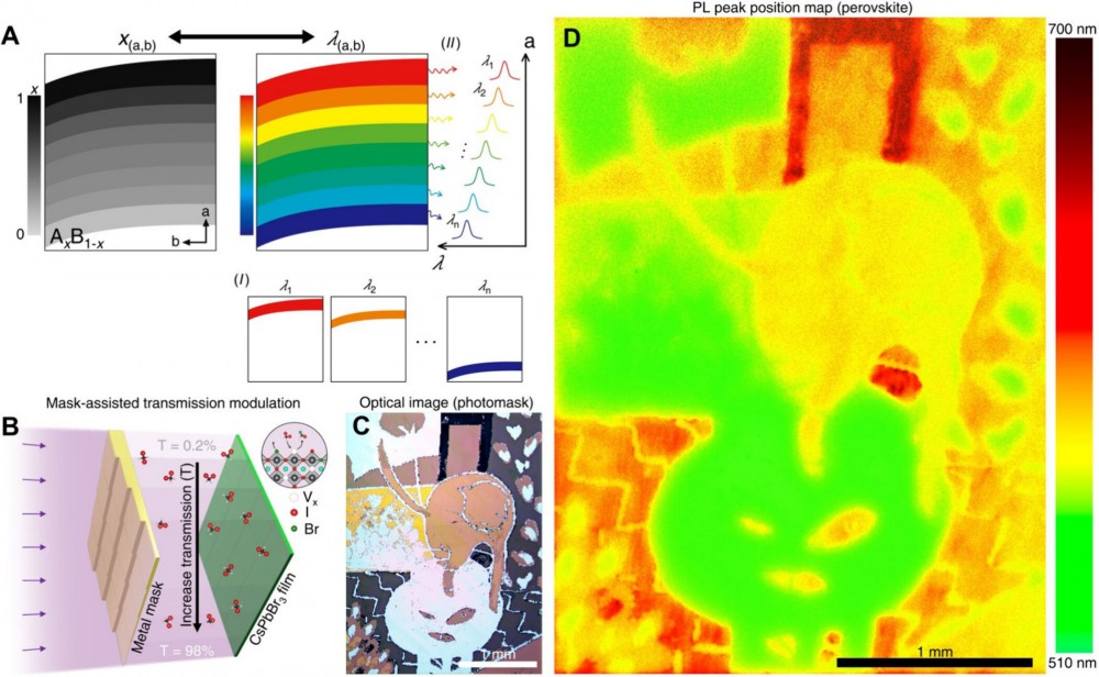 Most modern optical display and sensing devices utilize a limited number of spectral units within the visible range, based on human color perception. In contrast, the rapid advancement of machine-based pattern recognition and spectral analysis could facilitate the use of multispectral functional units, yet the challenge of creating complex, high-definition, and reproducible patterns with an increasing number of spectral units limits their widespread application. Here, we report a technique for optical lithography that employs a single-shot exposure to reproduce perovskite films with spatially controlled optical band gaps through light-induced compositional modulations. Luminescent patterns are designed to program correlations between spatial and spectral information, covering the entire visible spectral range. Using this platform, we demonstrate multispectral encoding patterns for encryption and multivariate optical converters for dispersive optics-free spectroscopy with high spectral resolution. The fabrication process is conducted at room temperature and can be extended to other material and device platforms.