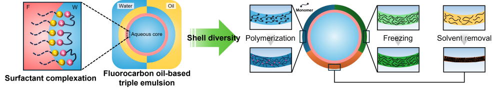 Microfluidic emulsion-templating offers the preparation of functional microcapsules with tunable compositions and structures that are otherwise inaccessible using conventional methods. However, the inherent nature of emulsions relying on the immiscibility of phases comprising the emulsion limits the use of a single platform for the realization of microcapsules with diversity in shell materials. Herein, fluorocarbon oil-based triple emulsions are utilized as templates to achieve microcapsule diversity through a single platform. By introducing fluorocarbon oil with omniphobicity as the interstitial phase between the core and the shell phase, additional degrees of freedom are provided in the library of shell materials applicable in the design of functional microcapsules. Moreover, it is demonstrated that surfactant complexation at the emulsion interface effectively enhances the stability of the emulsion. This grants the use of various solidification methods including polymerization, freezing, and even solvent removal without delicate control of spreading coefficients or complex surfactant synthesis processes. The showcased microcapsule diversity signifies pivotal breakthroughs in microencapsulation technologies, illustrating how the synergistic use of fluorocarbon oil and interfacial complexation of surfactants in emulsions provides true freedom in universal microcapsule shell design for various applications including cosmetics, food, drug delivery, and cell therapy to name a few.