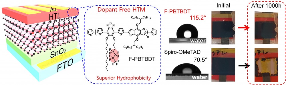 Hole-transport materials (HTMs) are crucial components in perovskite solar cells (PSCs) for achieving both efficiency and stability of PSCs. Thus, to solve the long-term stability problem of PSCs, we design and introduce a novel dopant-free HTM, F-PBTBDT. F-containing side chain in the F-PBTBDT molecule contributes to the moisture durability of perovskite films. Additionally, the F-PBTBDT molecule facilitates the hole extraction, owing to the suitable energy level matching with the perovskite film. Because of these advantages, PSCs with F-PBTBDT achieved a high efficiency of 19.5%. Furthermore, under extremely humid conditions for 1000 h, the PSCs with F-PBTBDT maintained 81% of their original efficiency. This work is noteworthy in that it provides a novel design strategy for dopant-free HTMs that can effectively boost the stability and the performance of the PSCs.