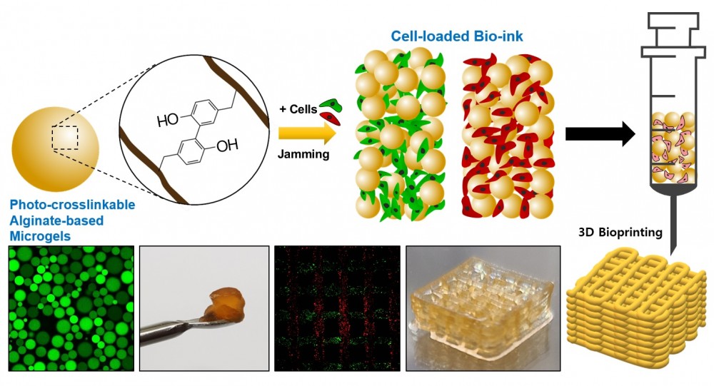 While the natural carbohydrate alginate has enabled effective three-dimensional (3D) extrusion bioprinting, it still suffers from some issues such as low printability and resolution and limited cellular function due to ionic crosslinking dependency. Here, we prepared a harmless visible light-based photocrosslinkable alginate by chemically bonding tyrosine-like residues onto alginate chains to propose a new microgel manufacturing system for the development of 3D-printed bioinks. The photocrosslinkable tyramine-conjugated alginate microgel achieved both higher cell viability and printing resolution compared to the bulk gel form. This alginate-based jammed granular microgel bioink showed excellent 3D bioprinting ability with maintained structural stability. As a biocompatible material, the developed multiple cell-loaded photocrosslinkable alginate-based microgel bioink provided excellent proliferation and migration abilities of laden living cells, providing an effective strategy to construct implantable functional artificial organ structures for 3D bioprinting-based tissue engineering.