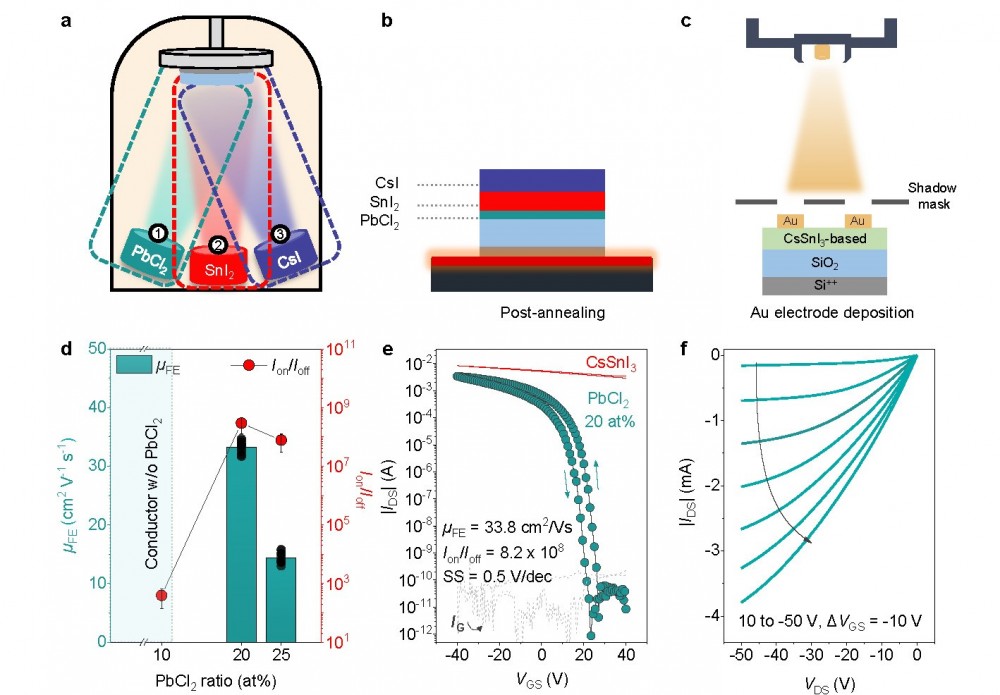 Solution-processed tin (Sn2+)-halide perovskites can be used to create p-channel thin-film transistors (TFTs) with performance levels comparable with commercial low-temperature polysilicon technology. However, high-quality perovskite film deposition using industry-compatible production techniques remains challenging. Here we report the fabrication of p-channel Sn2+-halide perovskite TFTs using a thermal evaporation approach with inorganic caesium tin iodide (CsSnI3). We use lead chloride (PbCl2) as a reaction initiator that triggers solid-state reactions of the as-evaporated perovskite compounds. This promotes the conversion of dense and uniform perovskite films, and also modulates the intrinsically high hole density of the CsSnI3 perovskite channels. Our optimized TFTs exhibit average hole field-effect mobilities of around 33.8 cm2 V−1 s−1, on/off current ratios of around 10^8, and large-area fabrication uniformity. The devices also exhibit improved stability compared with solution-deposited devices.