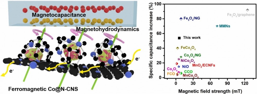 This study aims to create an efficient anode hybrid electrode material for the assembly of asymmetric supercapacitor (ASC) and to further enhance electrochemical performance under moderate external magnetic fields (MFs), addressing the challenges of low energy density in supercapacitor devices while maintaining cycle life and power density. The well-integrated hybrid heterostructures, which embed Co/Co3O4 nanoparticles in nitrogen (N)-doped carbon shells and sheets (Co@N–CNS), demonstrate exceptional physical and electrochemical properties. At a current density of 1.5 A g−1, it exhibits a specific capacitance of 1579.8 F g−1 in a half-cell configuration. Furthermore, the gravimetric capacitance increases to 2429 F g−1 under a MF of 6 mT. The enhanced energy storage performance is attributed to the reduced charge transfer resistance (Rct) and solution resistance (Rs) resulting from magnetoresistance and magnetic hydrodynamics (MHD) effects. The asymmetric supercapacitor exhibits an outstanding energy density of 221.4 W h kg−1 and power density of 1.58 kW kg−1 at 1.5 A g−1 under a 6 mT MF strengths. It also demonstrates excellent cycling stability (96.2 %) after 10,000 cycles under the same field strength. These results outperform most cobalt-based hybrid electrode materials reported to date. This is the first investigation on a ferromagnetic hybrid electrode material for supercapacitors that demonstrates superior electrochemical performance under both zero and moderate MFs.