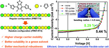 Morphologies and optoelectronic/mechanical properties of semiconducting polymers are significantly affected by their configurations. In this study, thiophene units are introduced into the backbone of a semiconducting polymer in either a regular (PffBT-T4) or a random (PffBT-RT4) manner to determine whether the resulting semiconducting polymers are suitable for developing efficient polymer solar cells. The energy levels of both polymers are highly similar because they share the same ratio of subunits in their backbones; however, PffBT-RT4 has lower crystallinity than PffBT-T4 due to its random configuration. Microstructural analyses indicate that PffBT-RT4 exhibits a shorter π–π stacking distance than PffBT-T4. Since short π–π stacking distance benefits interchain charge transport, PffBT-RT4 shows higher space-charge-limited current mobility, and PffBT-RT4 solar cells exhibit higher power conversion efficiency (PCE; 8.84%) than their PffBT-T4 counterparts (7.25%). In addition, PffBT-RT4 solar cells with active layers, prepared using a green solvent without any additive, show an encouraging PCE of 7.23%. Moreover, flexible solar cells based on PffBT-RT4 are much more stable during bending cycles than PffBT-T4 flexible solar cells. Therefore, this study demonstrates that the random configuration approach is a promising design strategy to realize semiconducting polymers for efficient, green-solvent-processable flexible polymer solar cells.