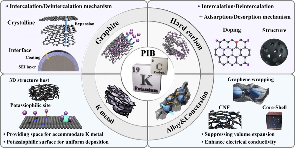 Recently, potassium-ion batteries (PIBs) have received significant attention in the energy storage field owing to their high-power output, fast charging capability, natural abundance, and environmental sustainability. Herein, we comprehensively review recent advancements in the design and development of carbon-based anode materials for PIBs anodes, covering graphite, hard carbon, alloy and conversion materials with carbon, and carbon host for K metal deposition. Chemical strategies such as structural engineering, heteroatom-doping, and surface modifications are highlighted to improve electrochemical performances as well as to resolve technical challenges, such as electrode instability, low initial Coulombic efficiency, and electrolyte compatibility. Furthermore, we discuss the fundamental understanding of potassium-ion storage mechanisms of carbon-based materials and their correlation with electrochemical performance. Finally, we present the current challenges and future research directions for the practical implementation of carbon-based anodes to enhance their potential as next-generation energy storage materials for PIBs. This review aims to provide our own insights into innovative design strategies for advanced PIB’s anode through the chemical and engineering strategies.