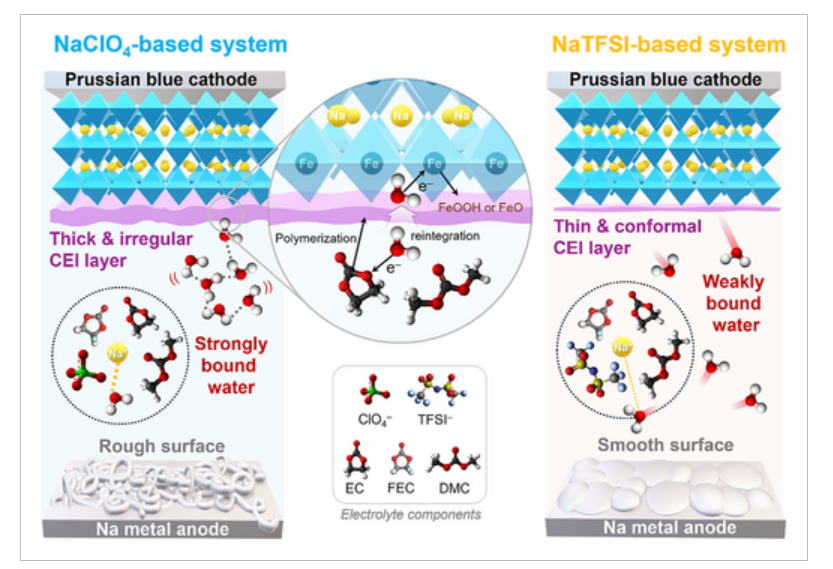 Prussian blue (PB) is a promising low-cost cathode material for sodium-ion batteries (SIBs), but the impact of crystal water on performance degradation remains unclear. This study explores how PB's crystal water interacts with different electrolyte salts—NaClO4 and NaTFSI—affecting solvation structure and interfacial stability. Based on the Hofmeister series, it is demonstrated that the strong hydration of ClO4– sustains water reactivity, promoting Fe oxidation and solvent decomposition at high voltages. In contrast, the weakly hydrated TFSI– suppresses water-induced side reactions and facilitates the formation of stable interphases on both cathode and anode. Electrochemical analysis at 4.0 V and 4.2 V revealed that NaTFSI consistently improves reversibility, particularly at 4.2 V, achieving 77.1% capacity retention over 500 cycles—56.8% for NaClO4. The results highlight the crucial role of electrolyte-dependent water coordination in determining PB electrode stability, offering valuable insights for designing electrolytes and interphases for long-life PB-based SIBs.