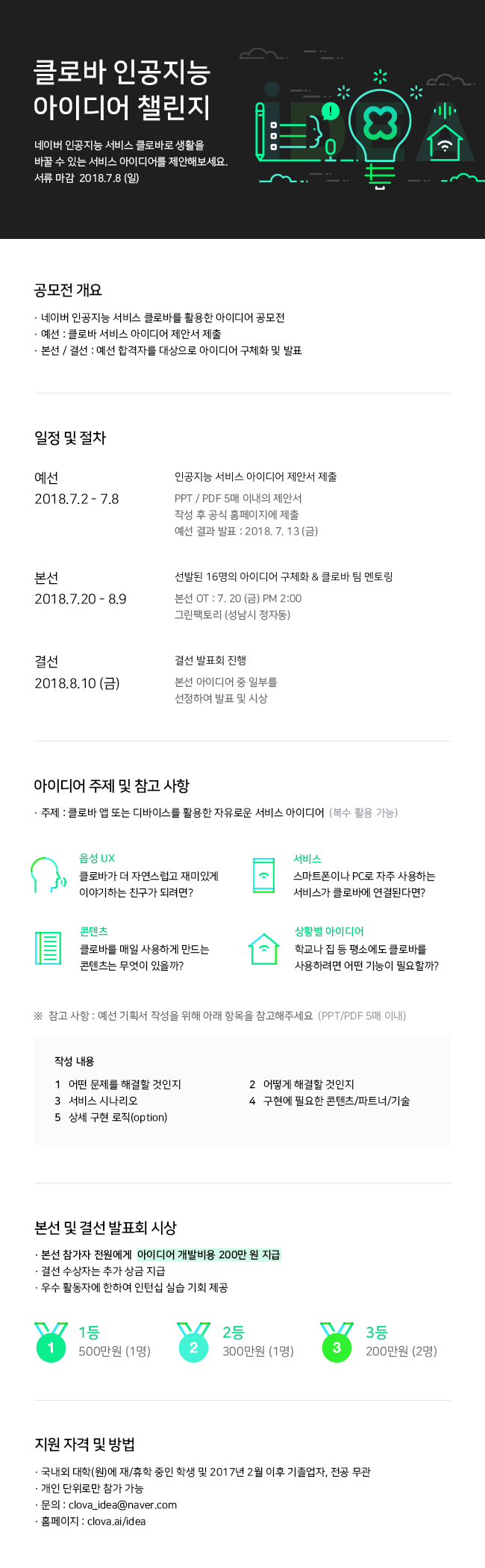 클로바 인공지능 아이디어 챌린지 네이버 인공지능 서비스 클로바로 생황을 바꿀 수 있는 서비스 아이디어를 제안해보세요 서류마감 2018.7.8 (일)
