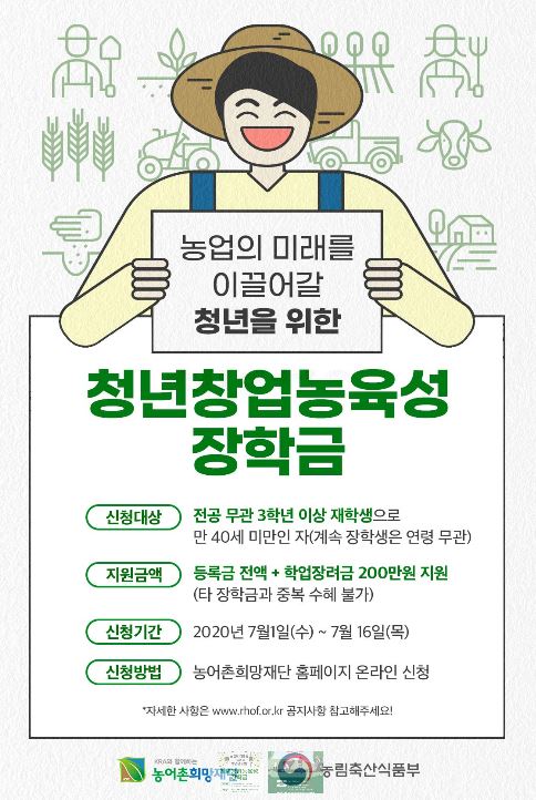 청년창업농육성장학금]을 신청해보세요. 농림축산식품부가 인정하는 국가장학생(100%지원)이