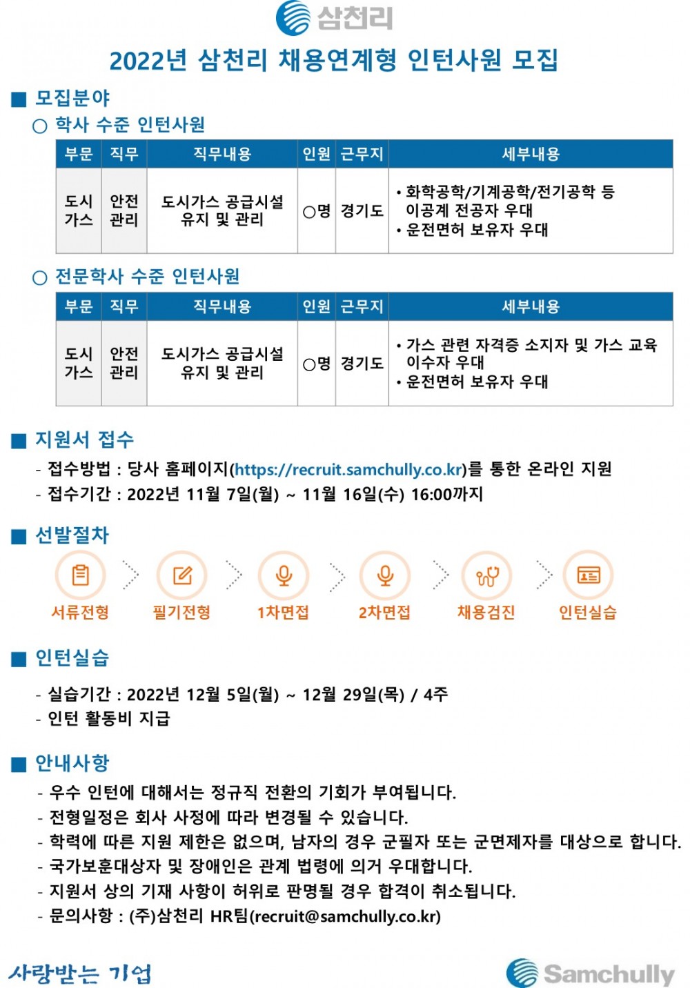 [(주)삼천리] 채용연계형 인턴 채용공고