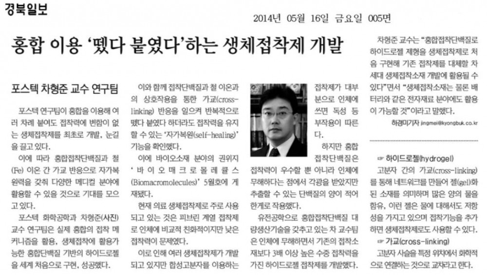 차형준 교수, 홍합 이용 '뗏다 붙였다' 하는 생체접착제 개발