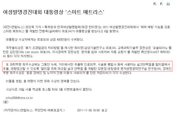과학부문 최우수상에는 그동안 누에, 거미에서만 추출해 인공피부, 수술용 봉합사 등에 사용하는 실크단백질을 말미잘에서 추출, 대량생산할 수 있도록 '말미잘 유래 재조합 실크 단백질'을 개발한 양윤정(포항공대 분자생명공학연구실 연구원)씨, 장애인 부문 최우수상은 '중증 장애인 및 노약자 전용 이동식 샤워의자'를 만든 차은미씨가 각각 수상한다.