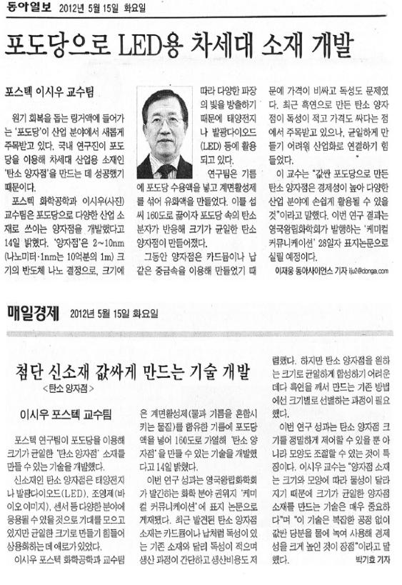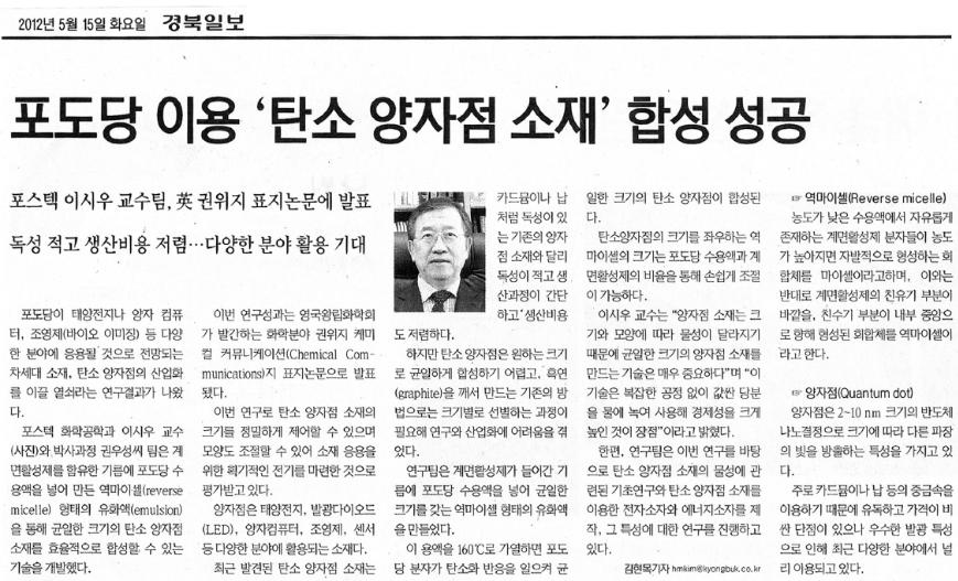 이 교수는 “값싼 포도당으로 만든 탄소 양자점은 경제성이 높아 다양한 산업 분야에 손쉽게 활용될 수 있을 것”이라고 말했다. 이번 연구 결과는 영국왕립화학회가 발행하는 ‘케미컬 커뮤니케이션’ 28일자 표지논문으로 실릴 예정이다.