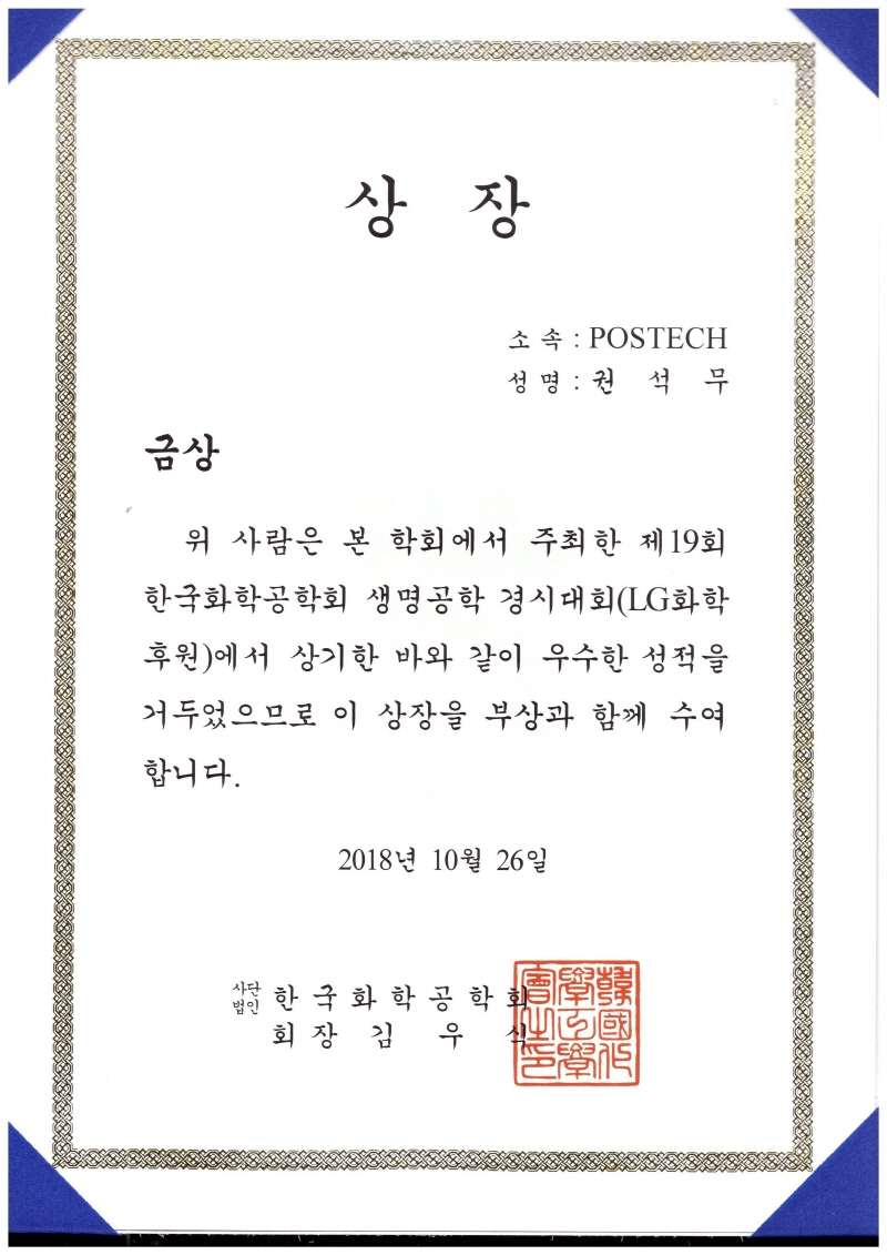 - 제19회 한국화학공학회 LG생명공학 경시대회 금상 수상
