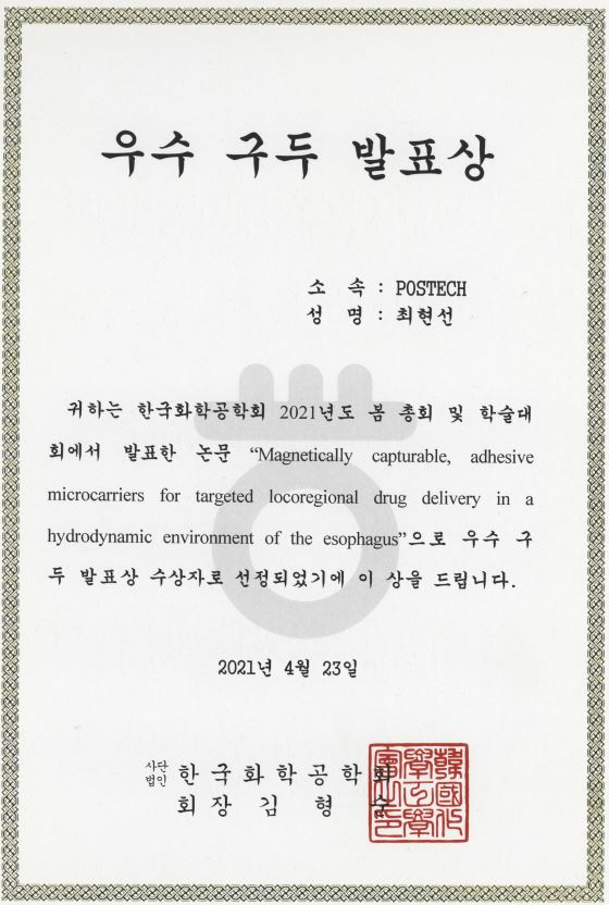 통합과정 최현선 학생 (지도교수: 차형준 교수)이 한국화학공학회 2021년도 봄 총회 및 학술대회에서 '우수구두발표상 ' 을 수상하였습니다.