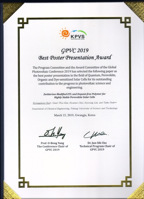 석박사통합과정 최경원 학생 (지도교수: 박태호)이 Global Photovoltaic Conference 2019에서 'Best Poster Presentation Award'를 수상하였습니다. 축하드립니다.