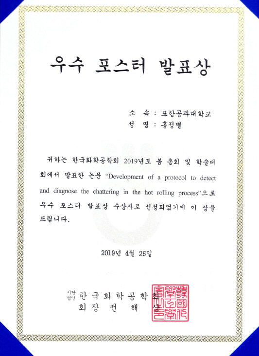 석사과정 홍정별 학생 (지도교수: 이인범)이 한국화학공학회 2019년 봄 학술대회에서 '우수 포스터 발표상'을 수상하였습니다. 축하드립니다.