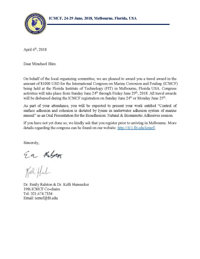 석박사통합과정 신민철 학생 (지도교수: 차형준)이 19회 International Congress on Marine Corrosion and Fouling (ICMCF)에서 ''Graduate student travel awards'을 수상하였습니다. 축하드립니다.