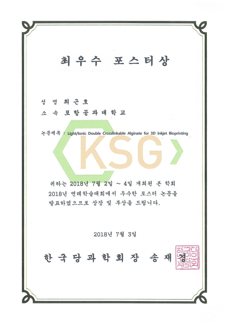 석박사통합과정 최근호 학생 (지도교수: 차형준)이 한국당과학회 2018년 연례학술대회에서 '최우수 포스터상' 을 수상하였습니다. 축하드립니다.
