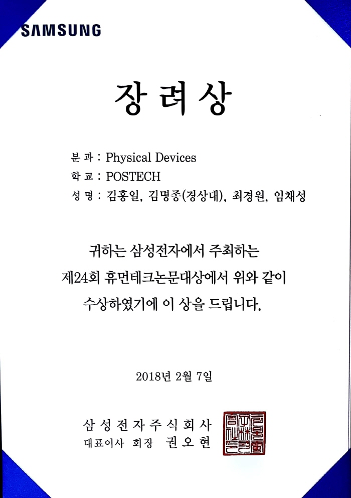 석박사통합과정 김홍일, 최경원, 임채성 학생이 삼성전자에서 주최하는 '제24회 휴먼테크 논문대상'에서 Physical Devices 분과에서 장려상을 수상하였습니다. 축하합니다.