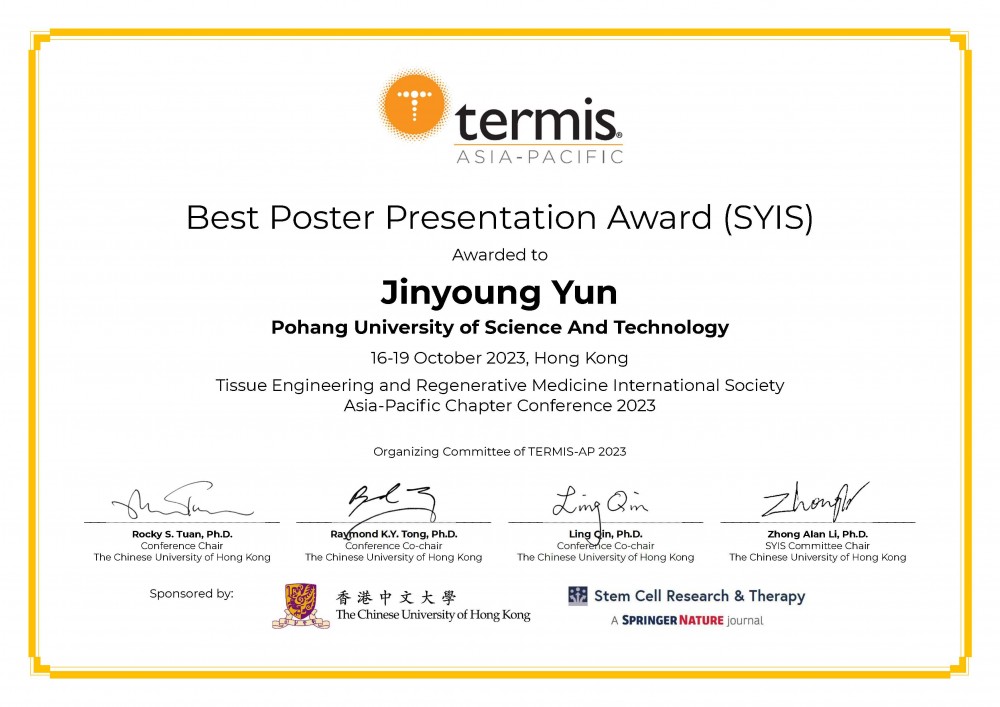 윤진영 학생(지도교수:차형준)이 TERMIS-AP에서 'Best Poster Presentation Award (SYIS)' 을 수상하였습니다.