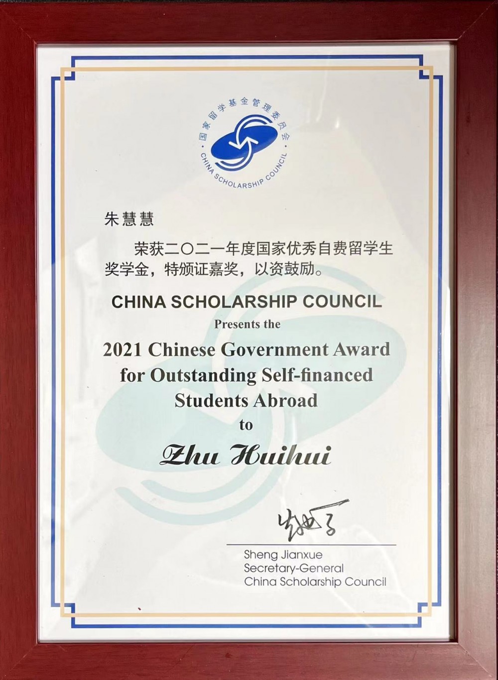 - The 2021 Chinese Government Award for Outstanding Self-financed Students Abroad