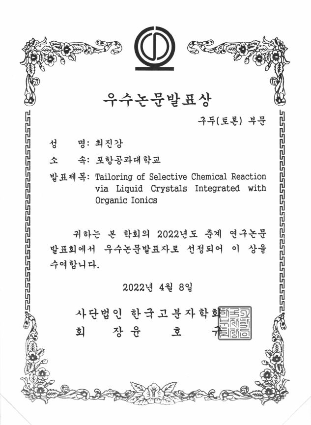 통합과정 최진강 학생 (지도교수: 김영기 교수)이 한국고분자학회에서 '우수논문발표상' 을 수상하였습니다.