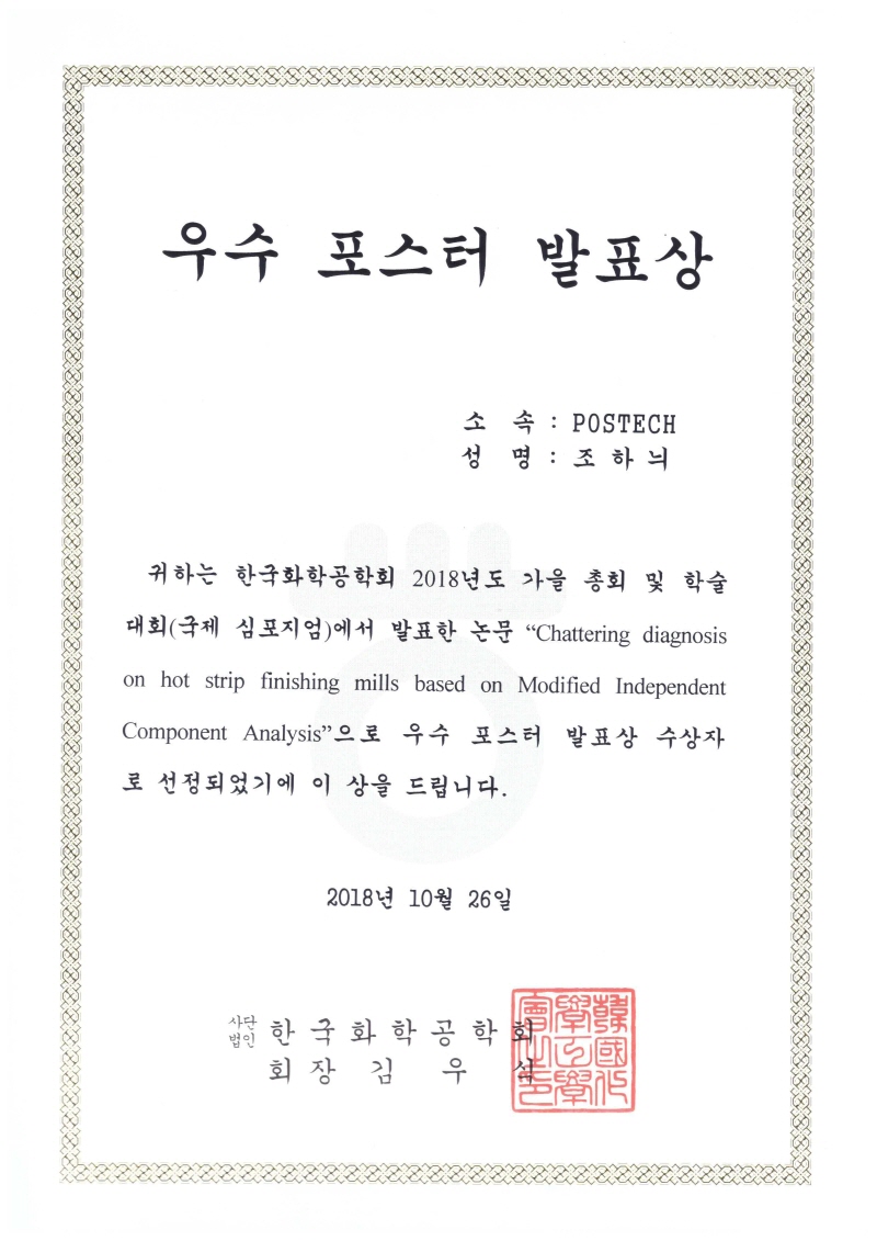 석박사통합과정 조하늬 학생 (지도교수: 이인범)이 한국화학공학회 2018년 가을학술대회에서 '우수 포스터 발표상'을 수상하였습니다. 축하드립니다.