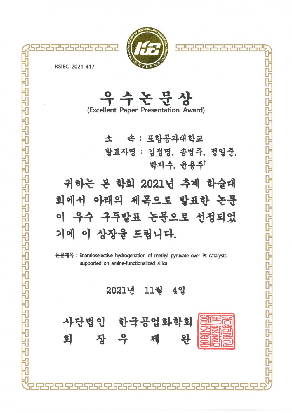 석박사통합과정 김정명 학생 (지도교수: 윤용주 교수)이 한국공업화학회 2021년 추계학술대회에서 '우수논문상(구두발표)'을 수상하였습니다.