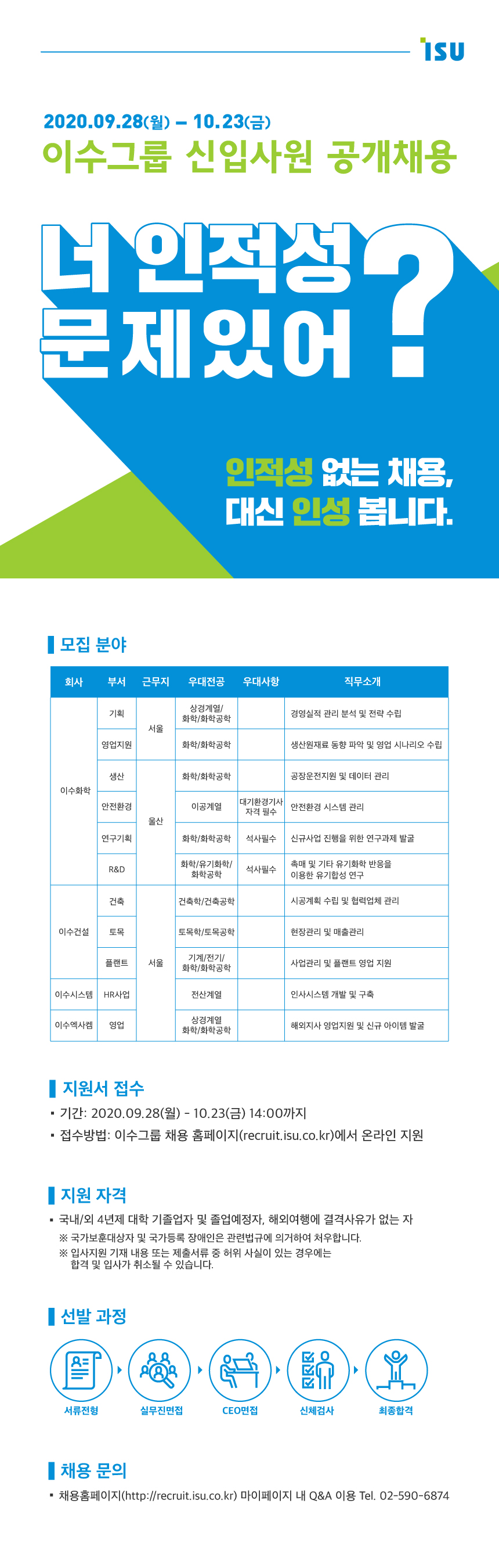 ㆍ접수방법: 이수그룹 채용홈페이지(https://recruit.isu.co.kr/)에서 온라인 지원