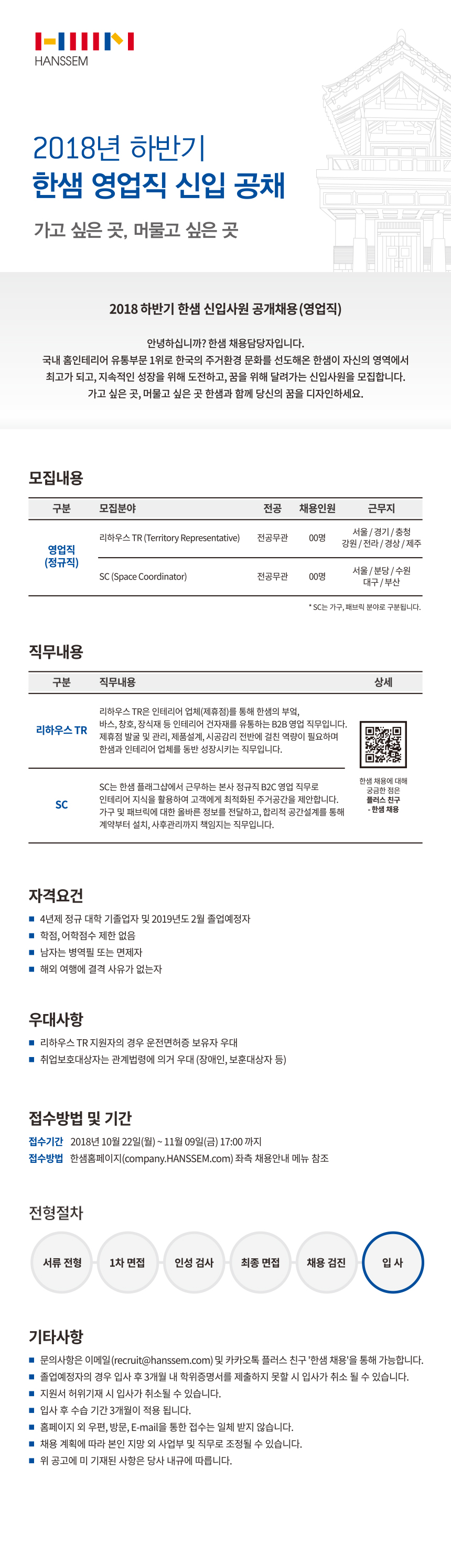 ■ 문의사항은 이메일(recruit@hanssem.com) 및 카카오톡 플러스 친구 '한샘 채용'을 통해 가능합니다.