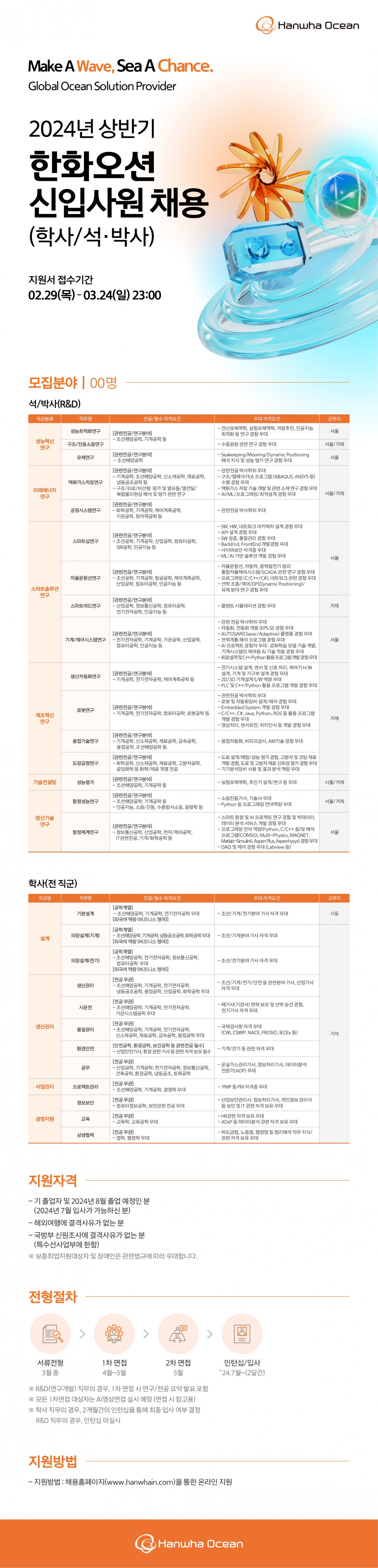 [한화오션] 2024년 상반기 한화오션 신입사원 채용 (~3/24)