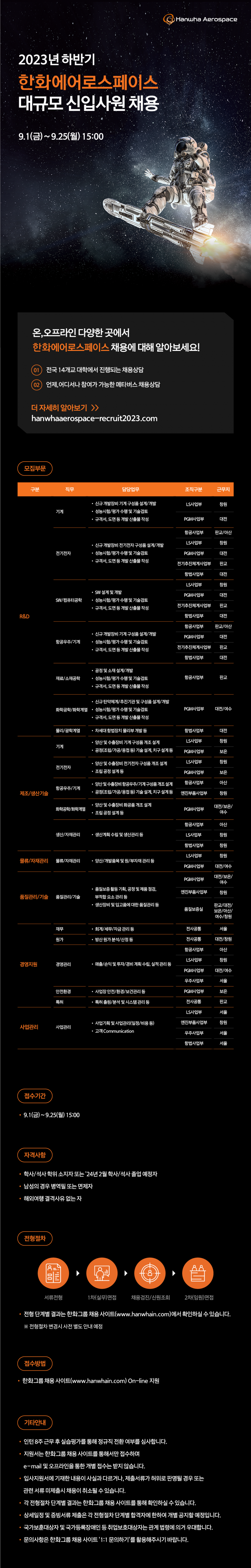 - 접수 방법 : 한화그룹 채용 사이트 '한화인' On-line 지원