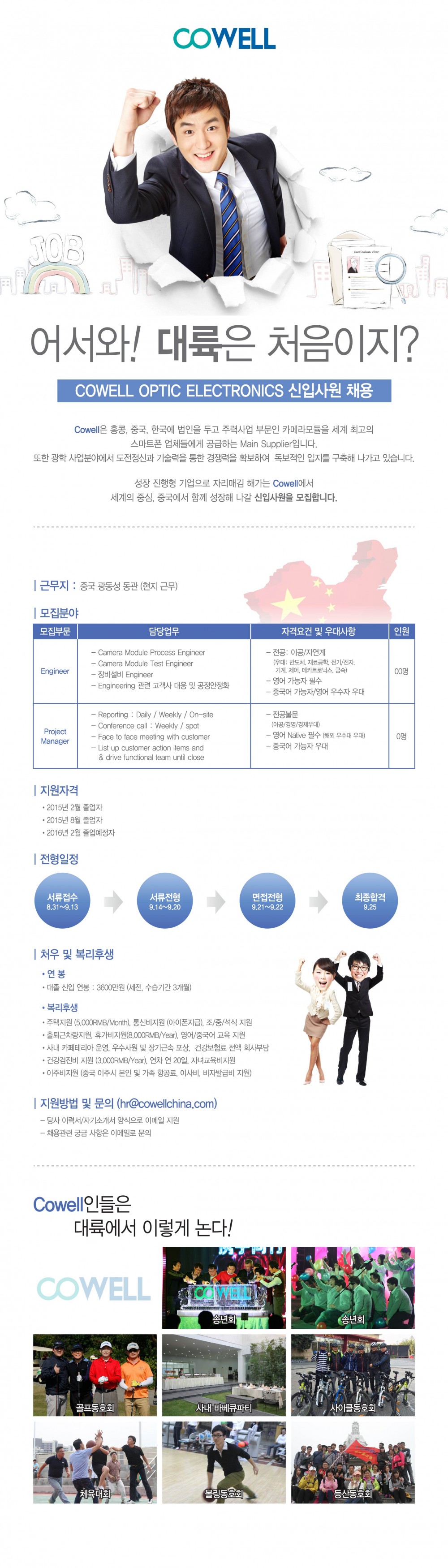 Cowell은 홍콩, 중국, 한국에 법인을 두고 주력사업 부문인 카메라모듈 세계 최고의 스마트폰 업체들에게 공급하는 Main Supplier입니다. 또한 광학 사업분야에서 도전정신과 기술력을 통한 경쟁력을 확보하여 독보적인 입지를 구축해 나가고 있습니다. 고객사의 다양한 수요에 맞춘 첨단제품을 끊임없이 개발하여 성장 진행형 기업으로 자리매김 해가는 Cowell에서 세계의 중심, 중국에서 함께 성장해 나갈 신입사원을 모집합니다.
