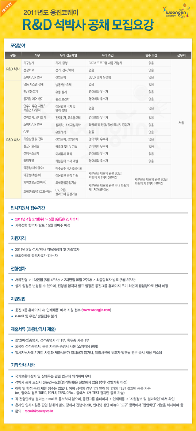 2011년도 웅진코웨이 R&D 석박사 공채 모집요강