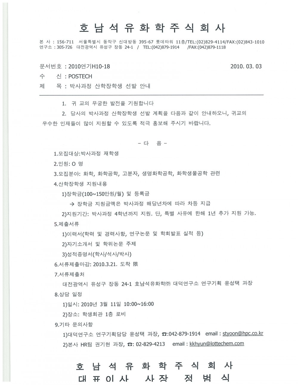 호남석유화학(주) 박사과정 산학장학생 선발 안내