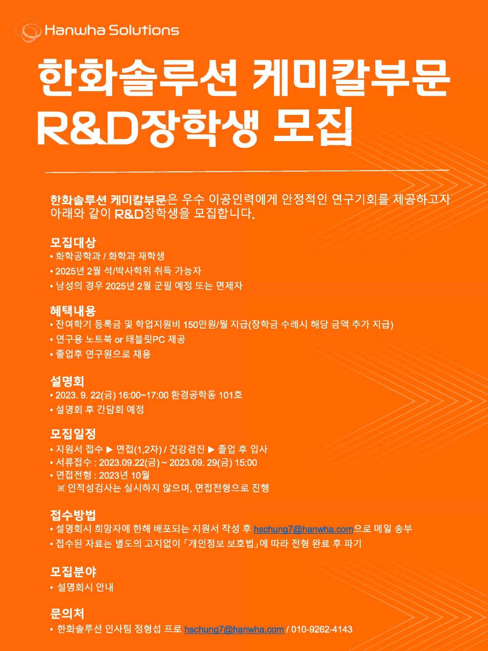 [한화솔루션] 한화솔루션 케미칼부문 R&D 장학생 모집 ( ~ 9/22)